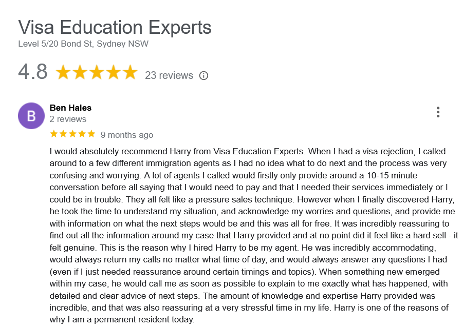I would absolutely recommend Harry from Visa Education Experts. When I had a visa rejection, I called around to a few different immigration agents as I had no idea what to do next and the process was very confusing and worrying. A lot of agents I called would firstly only provide around a 10-15 minute conversation before all saying that I would need to pay and that I needed their services immediately or I could be in trouble. They all felt like a pressure sales technique. However when I finally discovered Harry, he took the time to understand my situation, and acknowledge my worries and questions, and provide me with information on what the next steps would be and this was all for free. It was incredibly reassuring to find out all the information around my case that Harry provided and at no point did it feel like a hard sell - it felt genuine. This is the reason why I hired Harry to be my agent. He was incredibly accommodating, would always return my calls no matter what time of day, and would always answer any questions I had (even if I just needed reassurance around certain timings and topics). When something new emerged within my case, he would call me as soon as possible to explain to me exactly what has happened, with detailed and clear advice of next steps. The amount of knowledge and expertise Harry provided was incredible, and that was also reassuring at a very stressful time in my life. Harry is one of the reasons of why I am a permanent resident today.