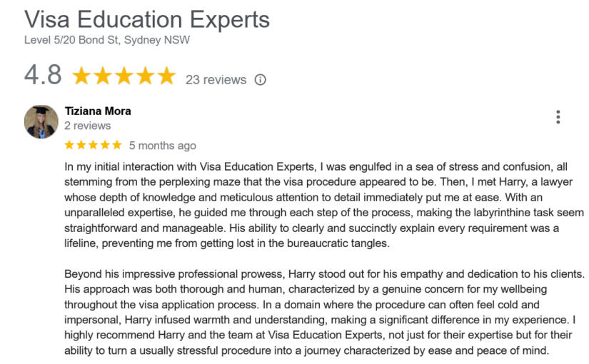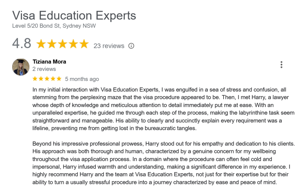 Beyond his impressive professional prowess, Harry stood out for his empathy and dedication to his clients. His approach was both thorough and human, characterized by a genuine concern for my wellbeing throughout the visa application process. In a domain where the procedure can often feel cold and impersonal, Harry infused warmth and understanding, making a significant difference in my experience. I highly recommend Harry and the team at Visa Education Experts, not just for their expertise but for their ability to turn a usually stressful procedure into a journey characterized by ease and peace of mind.