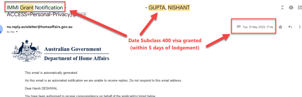 Here is the screenshot as proof of subclass 400 visa being granted within 5 days on 31 May 2022: