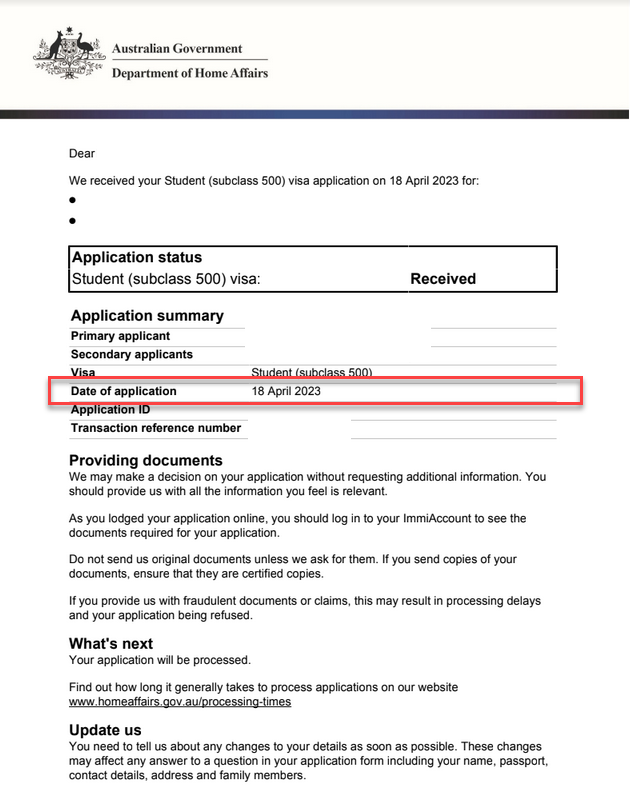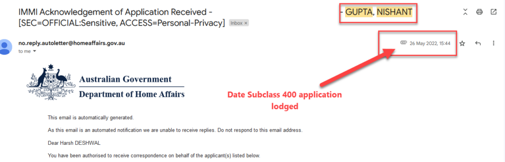 Here is the screenshot as proof of lodgement of subclass 400 visa on 26 May 2022: